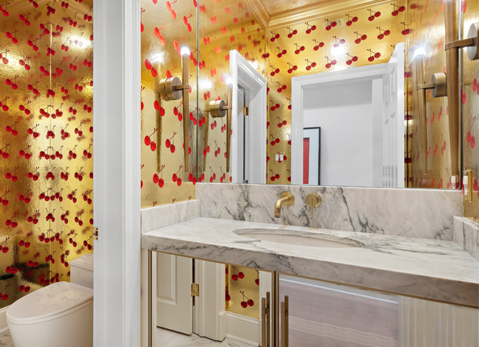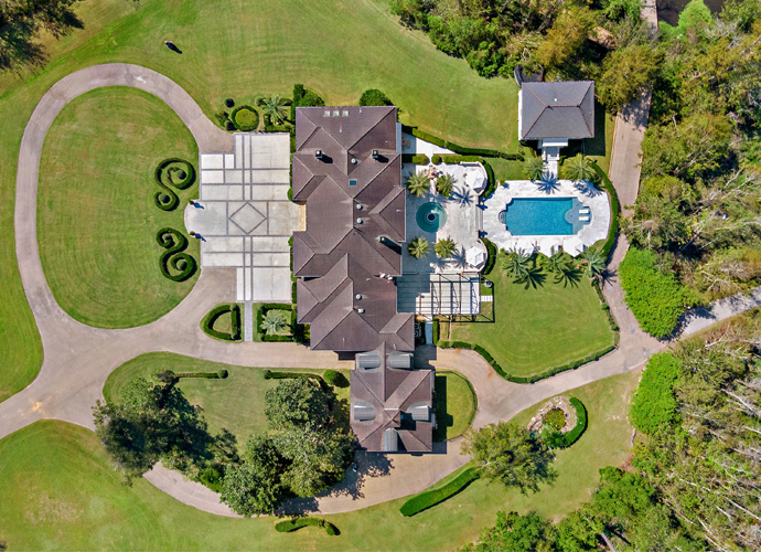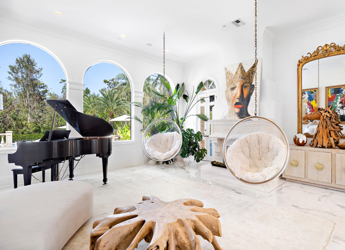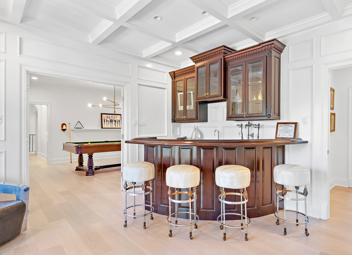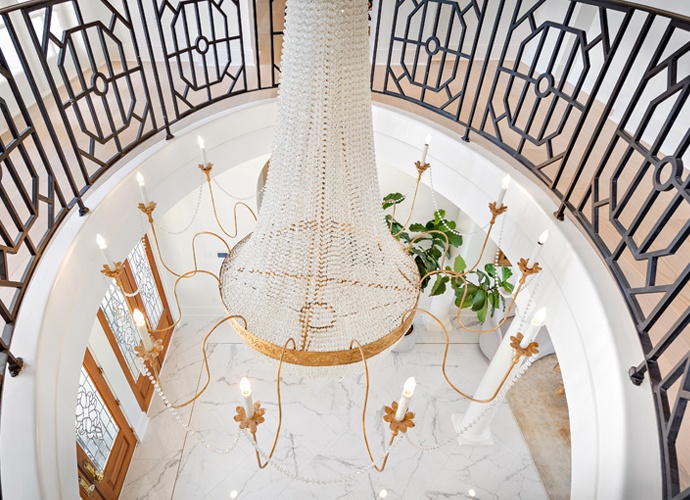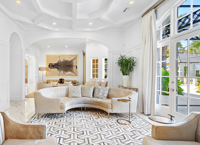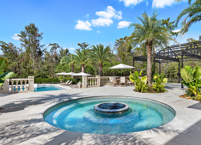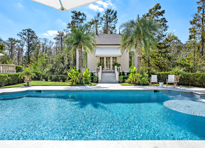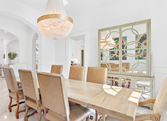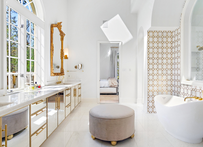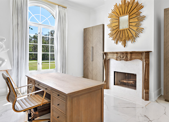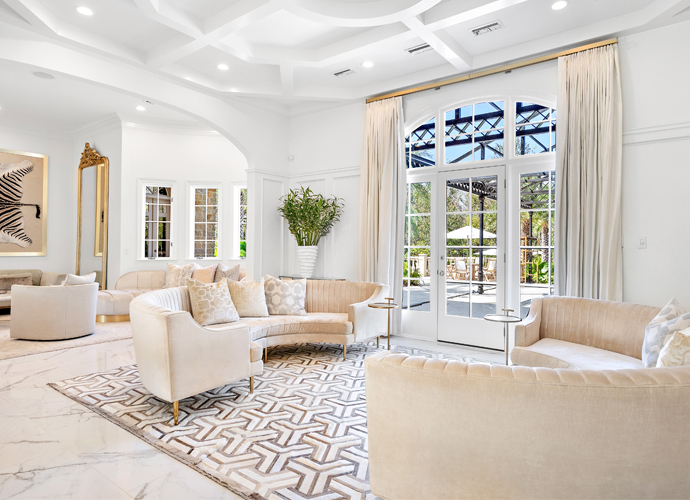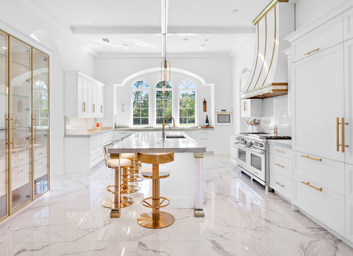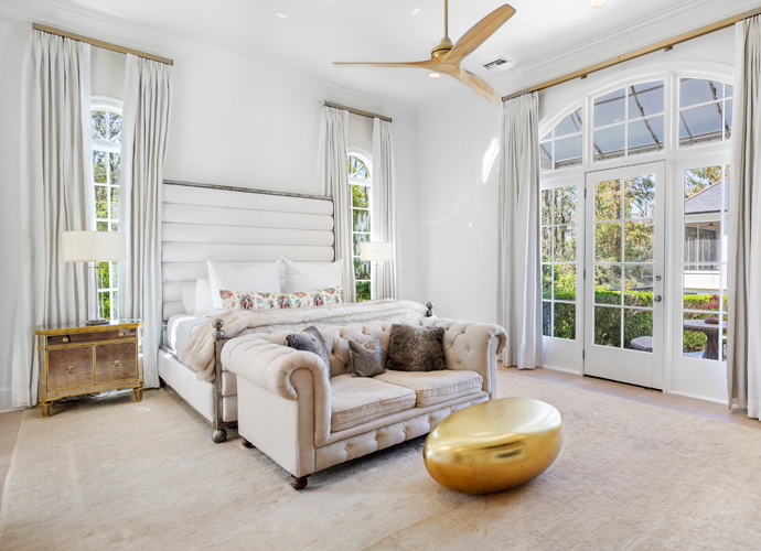 Performing design duties herself, Chi chose a largely monochromatic palette in shades of white with gold accents. The Bergerons added marble floors and vanities, quartzite countertops and extended the bar in the kitchen to achieve more countertop area. Because Mark is in the restaurant business and loves to cook, the kitchen appliances were upgraded to Wolf Sub-Zero. Outdoors, the pool and pool house were renovated, and a palm tree-surrounded hot tub with fire feature was added.