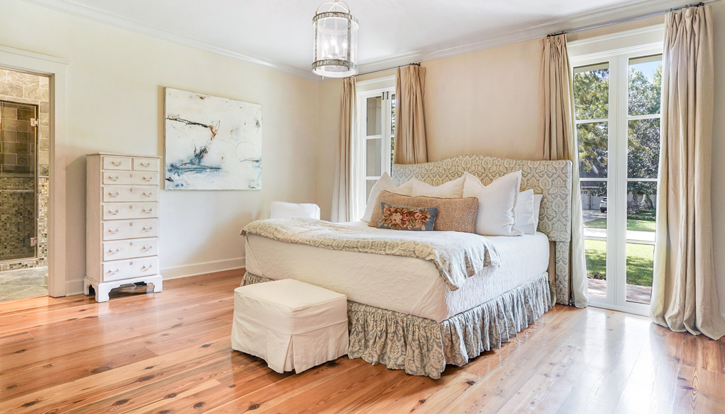 The two-by-twelves became extra-wide plank flooring for the master suite, while the old heart pine flooring now resides in the other bedrooms. “Now our grandchildren walk on the same floors that my grandparents – their great-grandparents! – walked on. It’s very special,” says Margaret. Old sinker cypress became doors and cabinetry in the front rooms of the home, and a custom entertainment center in the family room is also made from the salvaged wood. Some other furniture pieces and even the outside dining table were also made for the family, in an effort to bring the sentimentality into the home’s magnificent garden