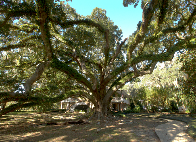 But one doesn’t need a history lesson to experience the magical properties of the sprawling giants. Like the ancients, many modern-day tree lovers experience a natural power of serenity and strength in the presence of these magnificent beings and particularly one as regal as the Mandeville natural wonder. Originally registered at the Live Oak Society as “Doby’s Seven Sisters” in 1968, it was named so because the Doby family owned the property where the tree grew, and Mrs. Doby was one of seven sisters. Prophetically, the tree bears seven huge limbs in a striking coincidence between its shape and the family who would bring it notoriety well into its maturity. Since then, the tree has been renamed “Seven Sisters Oak” and re-registered with the Live Oak Society. And true to its symbolic heritage, it continues to solidly endure, even weathering a potentially devastating near lightning strike during Hurricane Katrina. This fairytale-like oak tree is now lovingly cared for by property owners John and Mary Jane Becker who have resided at the Northshore home for over 13 years.Â