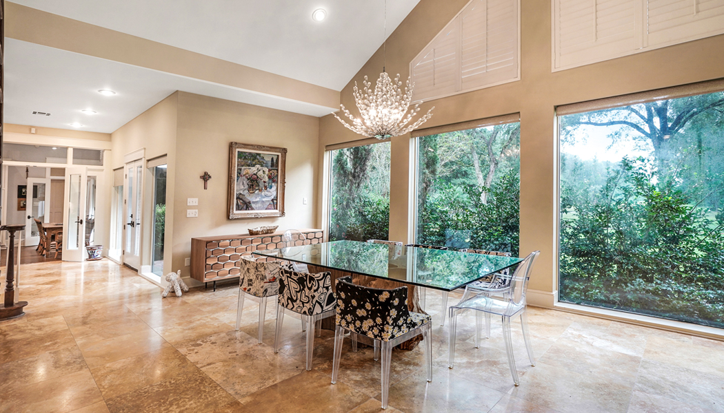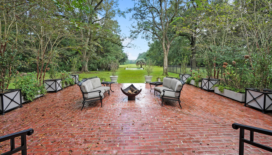 With its deep, brick-floor porches and patio spaces, the traditional front of the home gives way to a more contemporary rear facade that plays with light and shadow to create geometric shapes along the walls. With its bountiful peaceful surroundings, pausing in front of any of the windows in the house provides a view better than the last. Marble floors and striking chandeliers create glamourous spaces within the framework of the tall ceilings and prolific garden scenery. Across the property, there are multiple spaces to sit and enjoy the beautiful landscaping, making it an incredible place for entertaining both large and small crowds. From wedding receptions to school fundraisers, the Brunos delight in hosting groups of people and help contribute to organizations they continuously support. Now that they are empty nesters, it’s time to downsize to a home that is better suited to just the two of them with their dogs, but this very special place will always hold a piece of their hearts.