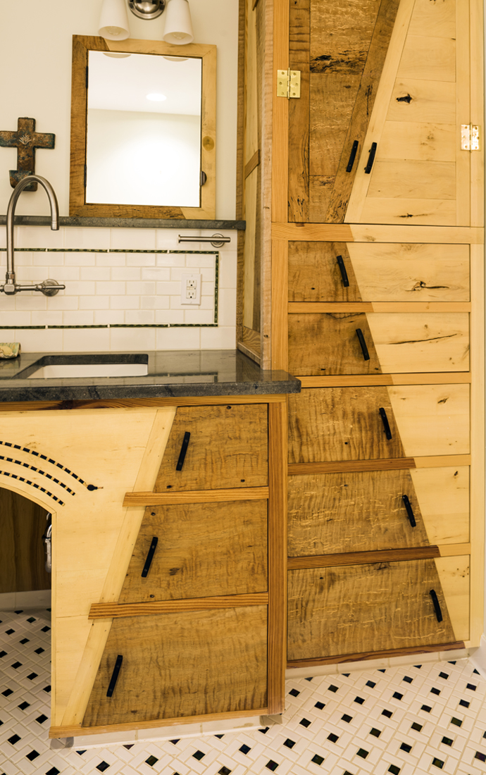 Using multiple species of cypress in the bathroom cabinetry gives a two-tone effect to the custom cabinetry. It is a high-end, bespoke effect in a room filled with enchanting details. Sinker cypress that was pulled from the water after hundreds of years bears a soft green tone. With its reds and yellows, antique heart pine is a beautiful complement to the sinker cypress. White tilework with black accents keep the color palette neutral while adding a classical punch to the floors and wall surrounds. Even here, natural light fills the room from petite, high windows—all without sacrificing privacy. In a second bathroom, sparkling glass blocks form an unusually shaped shower stall: rounded, not square, with a colorfully pebbled floor inside.