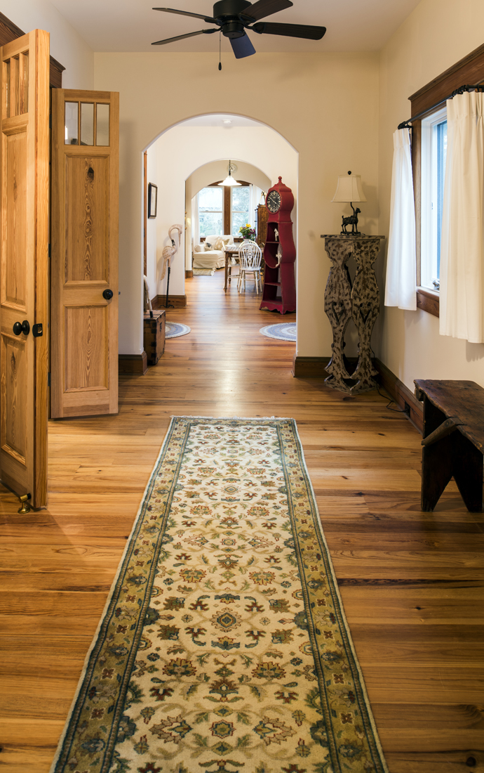 Glowing heart pine floors unite the rooms of the home with their honeyed caramel tones. Stainless steel appliances and an olive-and-gray tone granite in the kitchen offer a welcome contrast to the home’s vintage feel. A creamy white wall paint plays a supporting role in the cast of characters, giving a sense of airiness to the home overall and emphasizes the incredible artwork that serve as focal points throughout the space. A painter herself, Hoopes makes regular use of the art room that features tall, open windows for ample natural light. It’s a painter’s dream to have such a lovely space in which to work.