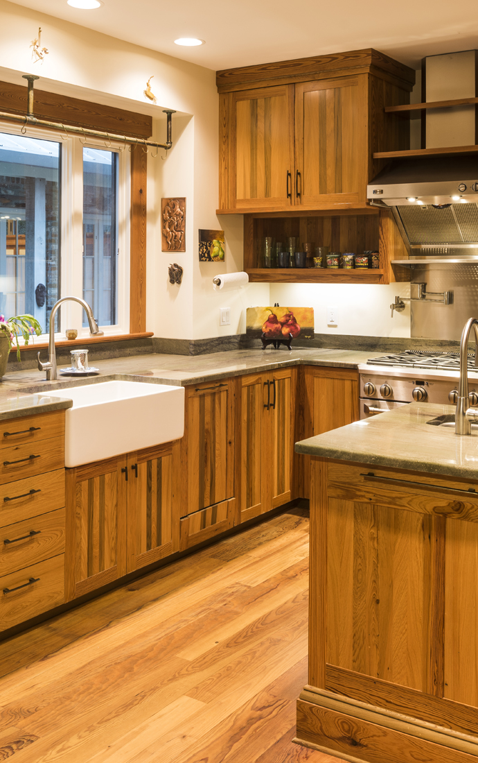 Having been a lover of horses all her life, Hoopes discovered while house hunting that some of the wood in the bathroom had been reclaimed from horse barns. “That’s how I knew it was the right fit,” she says. No detail is lost in any of the exqisite woodwork in this cottage. Contemporary handles and pulls accent the rustic beauty of the wood itself, and they are placed in such a way that make an onlooker pay attention, rather than just skimming over quickly.
