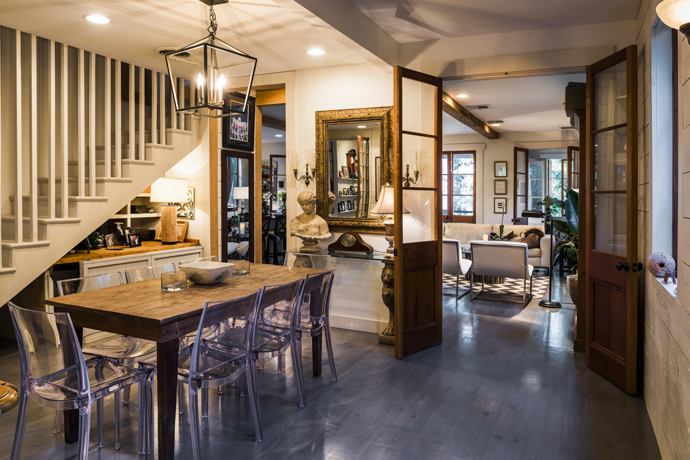 The most recent renovation took out some of the original doorways, replacing them with taller, glass-paned French doors. Adding the ceiling-level height to the doors gave an modern touch to the whole space, and the glass gives a breezy, open feeling, even when they’re closed.