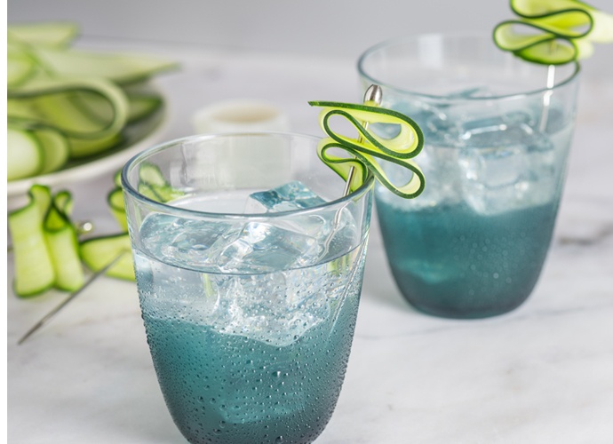 1½ ounces sapphire gin, 1 ounce fresh lime juice, 1 ounce simple syrup, ¼ ounce blue curaçao, 4 to 5 thin slices of cucumbe