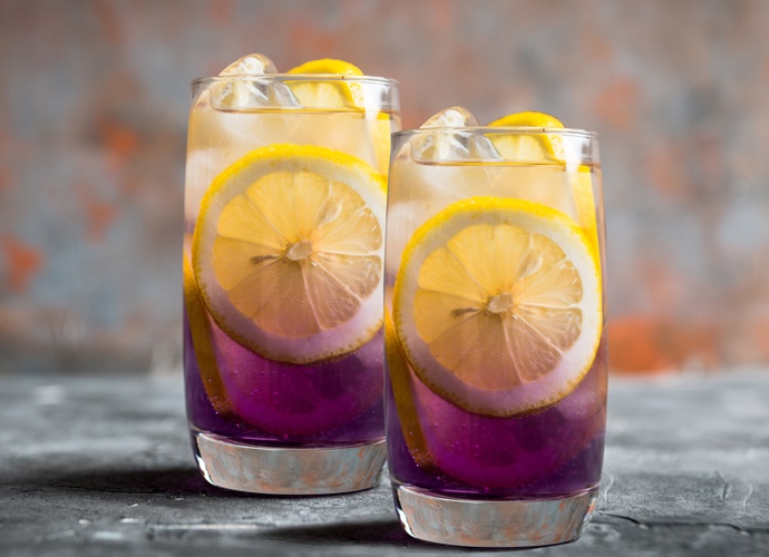 1½ ounces vodka, 3 ounces lemonade, ½ ounce blue curaçao, ¼ ounce grenadine, Lemon slice for garnish