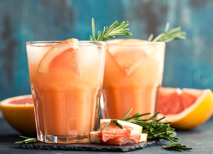 ½ cup freshly squeezed pink grapefruit juice, ¼ cup lime juice, ¼ cup ginger ale, 1½ ounces white rum, Rosemary and grapefruit slice for garnish