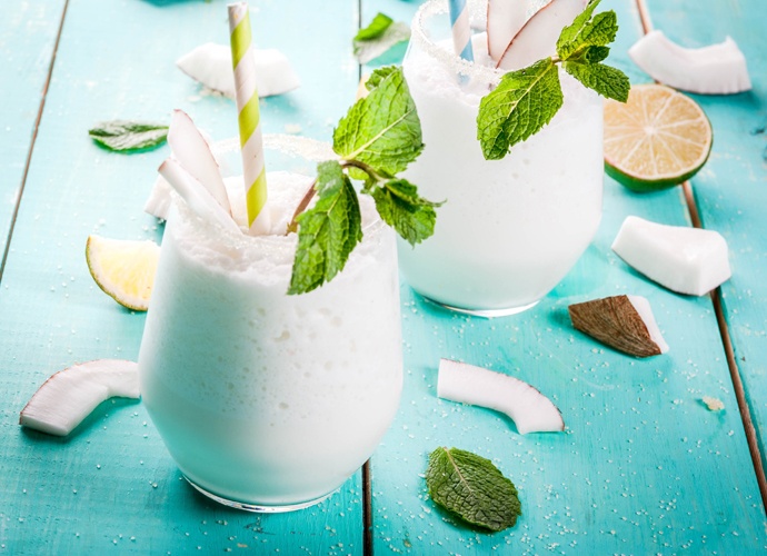 2 ounces cream of coconut, 2 ounces coconut rum, 1 ounce fresh lime juice, 4 fresh mint leaves, 2 cups ice