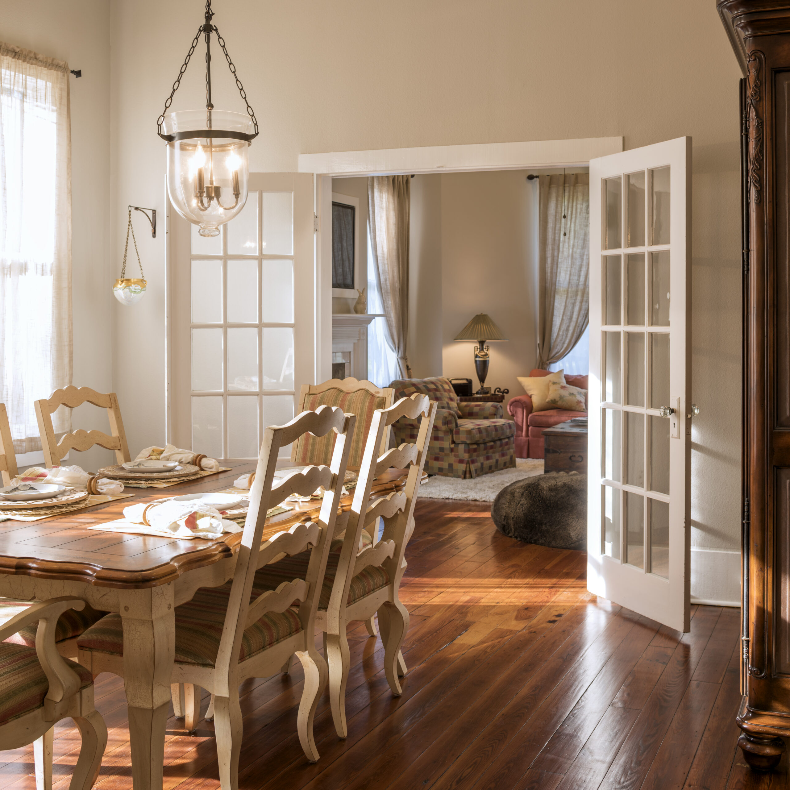 Unlike some homes built in this time period, the lineage of this one is fairly clear. Records date back to the original owners, the Galatas family, whose head of household was also the sheriff of St. Tammany Parish. In the original town of New Covington, Boston Street served as the dividing line: the working class lived on this side while the wealthier residents lived in larger, more elaborate houses on the other side of Boston Street. Nowadays, even the smaller homes are prized antiquities when restored as carefully as this one has been. The center hall cottage style is an extremely efficient floor plan, creating a welcoming entryway yet wasting no space. It’s a perfect example of how attuned past generations were to building for the Louisiana climate. From the wide center hall, nearly every room is visible, with tall doors and transoms that open up every wall in the entire house. This would allow even the slightest breeze to flow through the entire house on a hot day, and with 14-foot ceilings, the warmest air would have risen above the standing height of its residents.