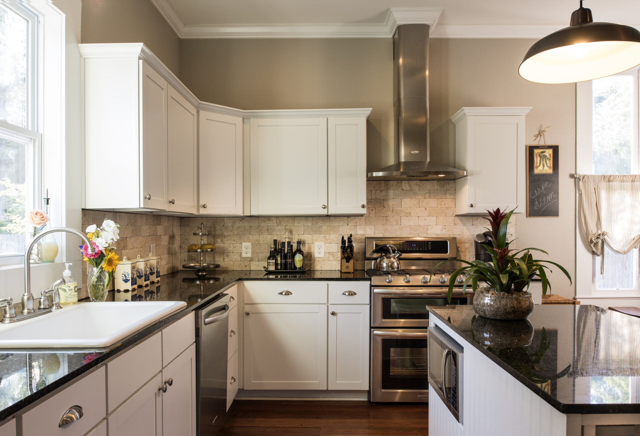 Even while respecting the age and vocabulary of the original home, modern features have been added. The original back porch is now a full laundry area, and what was once a small nursery area has morphed into a dressing room just off the master bathroom. For a structure that would not have had indoor plumbing when it was originally constructed, the addition of such features seem obvious today. Using classical materials in soft tones helps prevent a jarring change from one space to another and adds to the timelessness of the space.