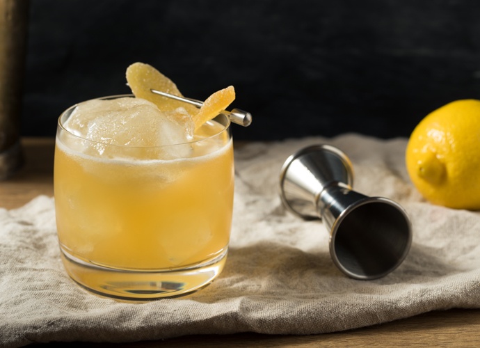 In a cocktail shaker, combine the lemon juice, simple syrup, blended scotch and Islay scotch. Add ice and shake 20-30 seconds. Strain into a rocks glass filled with ice and garnish with candied ginger pieces.