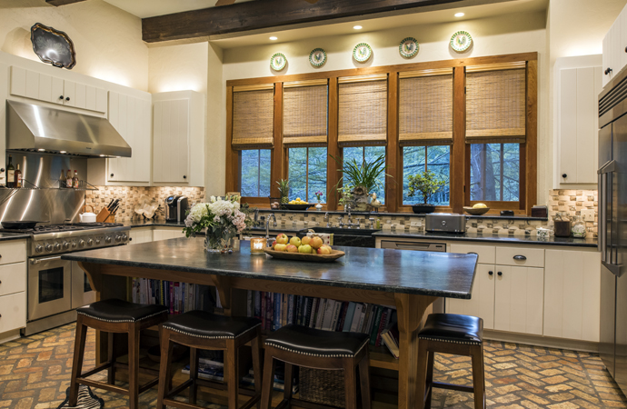 During a remodel several years ago, the kitchen was expanded from one area into an addition, leaving the former kitchen to become a combination art-and-laundry room with an overflow of appliances that are useful for holiday cooking. Soapstone counters are hardy, stain-resistant and don’t compete with the herringbone pattern of the brick floors. A bank of five windows give an expansive feel to the open-plan kitchen, and soft uplighting fills the space above the white-painted plank cabinetry. The collection of antique Italian rooster plates featured above the kitchen sink windows were in her grandmother’s Highlands, N.C. home when Megan was a girl. Their age and patina provide a perfect foil to the simple, contemporary lines of the kitchen.
