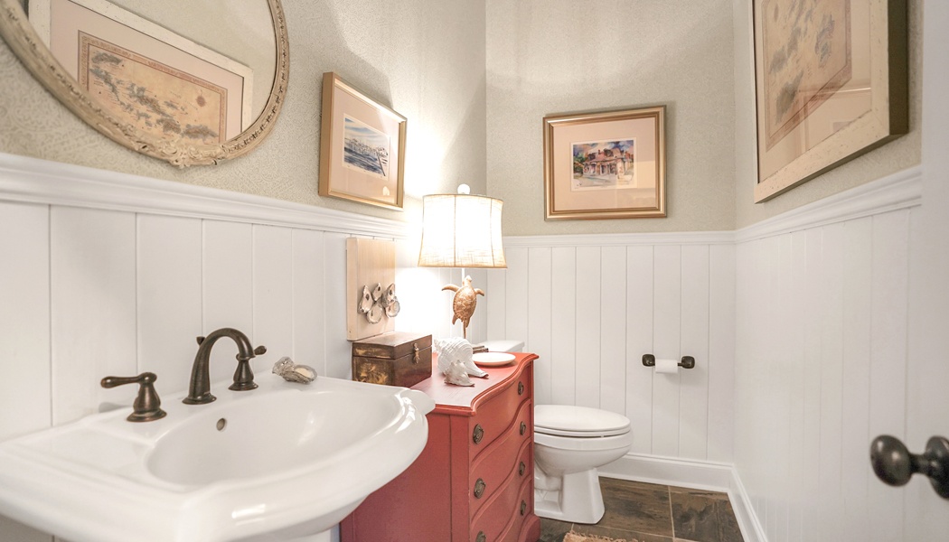 The coastal theme was embraced full force in the powder room where it’s always nice to have some fun. White v-board wainscoting plus sky blue wallpaper take a hallway mainstay from plain to pleasant. Her grandmother’s mirror hangs above the sink and a map of Tortola, a favorite sailing destination, fills the wall.