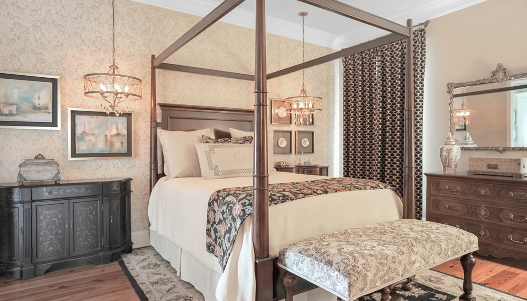 In the master bedroom, the couple wanted to remove the flat-screen television and create a more peaceful retreat, specifically with a comfortable chair for reading. Creating an accent wall with a beautiful gold damask wallpaper gives a timeless elegance to the space, which is juxtaposed with bright contemporary artwork above the nightstand. This focal point is visible from the main room when the door is left open and the pop of blue gives balance to the entire space. More of the exotic heirlooms are on display, from the collection of gold-rimmed plates to the antique ginger jars on the dresser. Using a wide-striped tonal wallpaper in the master bathroom continues the subtle shimmer of gold and cream that visually defines the master suite.