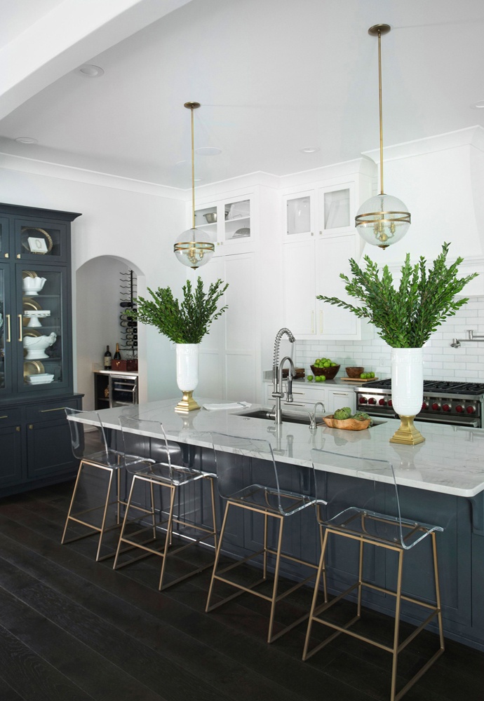 The indoor kitchen areas house Wolf appliances, a galley-sink and custom cabinets surrounded by Paper White walls. The area is adorned with gold hardware and light fixtures. A slate-gray hutch matches the cabinet style and holds white and gilded wares that are more sculptures than serving dishes. What is disguised as a part of the symmetrically-balanced cabinets, is actually a door leading to the butler’s pantry which craftily houses the microwave and other appliances out of sight while still keeping them accessible. The pantry floor is set with the Turkish marble used outside, but here it’s polished and shows darker and wider gray veins.