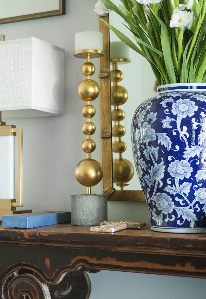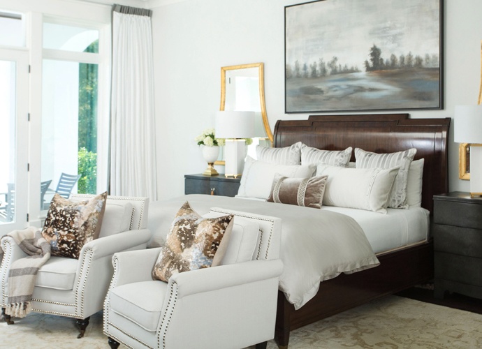 Continuing through the home, one enters the massive master suite through a special barn door hiding a love note from Chad to Shana, inscribed as he was constructing the cypress portal. Dark furniture pieces–some new and some treasured antiques–are balanced by pale, muted velvets and linens, with the extremes mediated by smoky blues. Artwork and accent pillows repeat those hues and add a gradient of tones in between. According to Malcolm, “All the bedroom’s appointments were intentionally designed to be soft and soothing, reflecting the serenity of life on the Northshore.” Tall windows let sunshine in from the pool area but are tempered by blackout curtains when sleep trumps daylight.