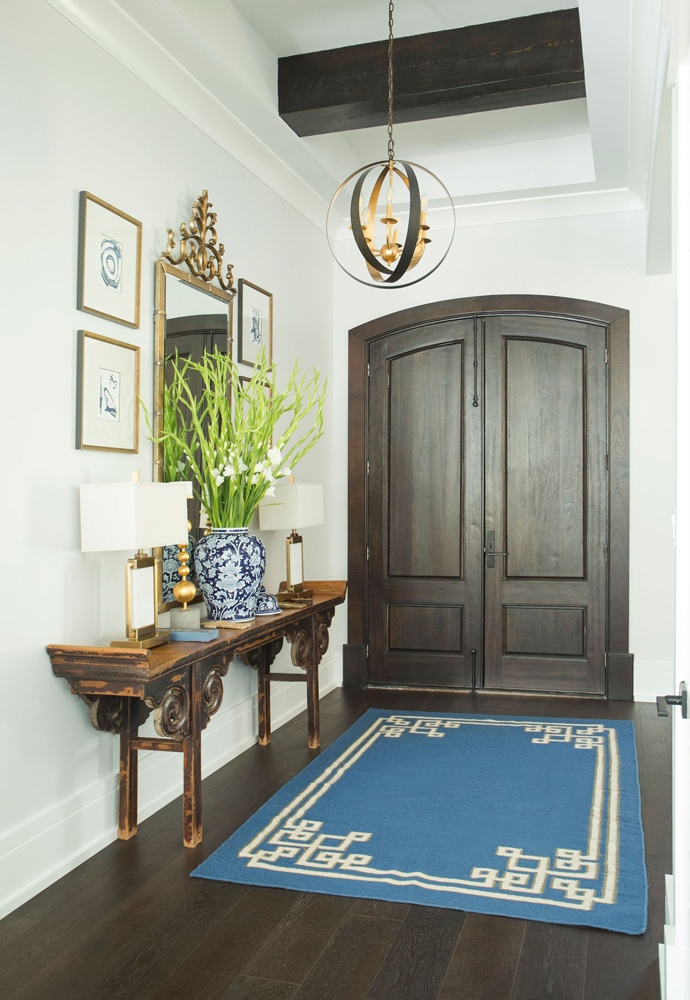Another unique feature is the interior baseboards, designed by Chad and milled into a one-of-a-kind, sleek, tall, squared profile. Those baseboards give rise to soaring ceilings–16 feet at their peak–which cover a spacious yet cozy living area. The great room’s white sofa and indigo club chairs are complemented by large custom abstracts. The entire living space is flanked by the foyer’s cobalt sisal rug on one end, and a view of the azure pool through the floor-to-ceiling windows on the other, bringing together the expansive indoor and outdoor areas.