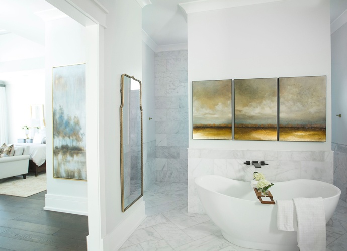 The master bath repeats the theme of sleek, square, white cabinets and the use of quartzite, but here, in charcoal and black hues. Gold-toned landscape art and gold hardware surround a freestanding soaking tub, and the room is grounded with marble of a subtly different color that runs throughout the oversized walk-through shower.