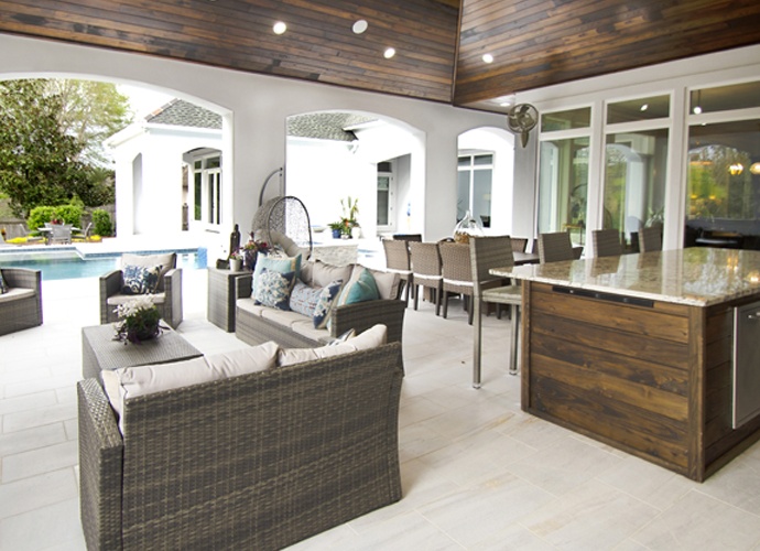 The Roigs employed Turkish marble throughout the home. “Because it’s all from the same quarry, it matches but adds the interest of different color variations and preparation into different products inside and out,” says Shana. “The 2,500 square feet of outdoor flooring is sandblasted so it’s not slippery. The marble used for the pool coping is a different shape, and for the facia, it’s split-faced and rough-hewn. Complementing that stone are quartzite tops that grace the outside counters which surround commercial-grade appliances including a four-burner stove, oven and grill.