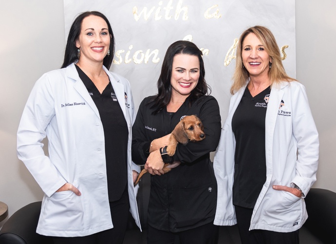 In early 2010, when LVRC changed ownership, the pair discussed opening a practice. By April 1 of that year, their vision had produced another, albeit very different, wonderful creation. South Paws Veterinary Surgical Specialists was born. “Healing Hands with a Passion for Paws” was their motto. “Bob had high goals for clients, and we both wanted something special for our community. It had to feel comforting for the pets and communication was key to making owners feel at ease.”