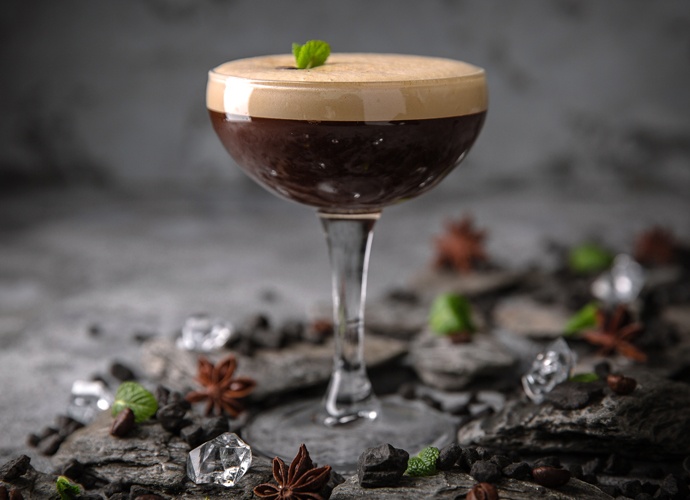 Combine the cooled coffee, vodka, coffee liqueur and Irish cream in a cocktail shaker. Fill with ice and shake until cold. Strain into a martini glass. Garnish with a mint sprig and cacao powder.