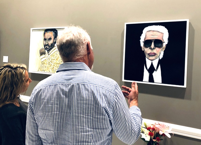 Montero paints the icons using house paint applied without tools or brushes. “I want to capture their soul and put it on canvas. I need to feel them in my hands,” he explains as he drags his fingers through his dark, uncoiffed curls. And because he uses durable house paint, he encourages viewers to feel the icons too. “I create unique, three-dimensional textures for hair and fabrics and smoother ones for skin for each subject. I want guests to experience the different personalities with their hands like I do.” The fourth dimension of the presentation is Montero’s own narration of his inspiration, process and design choices bringing each depiction of diverse human experience to life. “I didn’t want to be in anyone else’s gallery. I wanted the whole presentation under my control”.