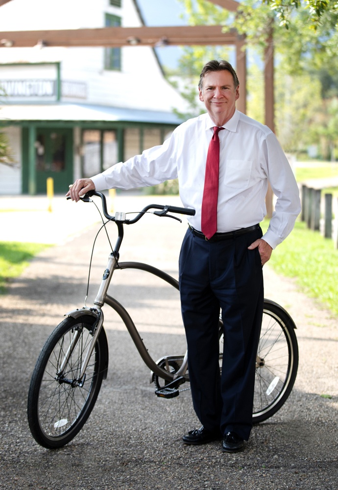 An accomplished man pedals along his childhood route, now bustling with activity but still lined with trees and the familiar feeling of home. For generations, his family has shared a deep-rooted dedication to shaping the future of a growing and prosperous St. Tammany while maintaining its character—a legacy he is proud to carry forward.