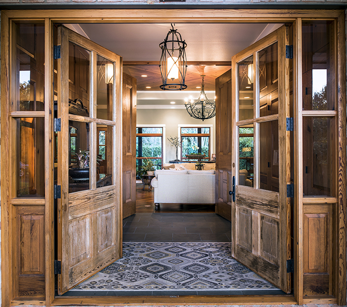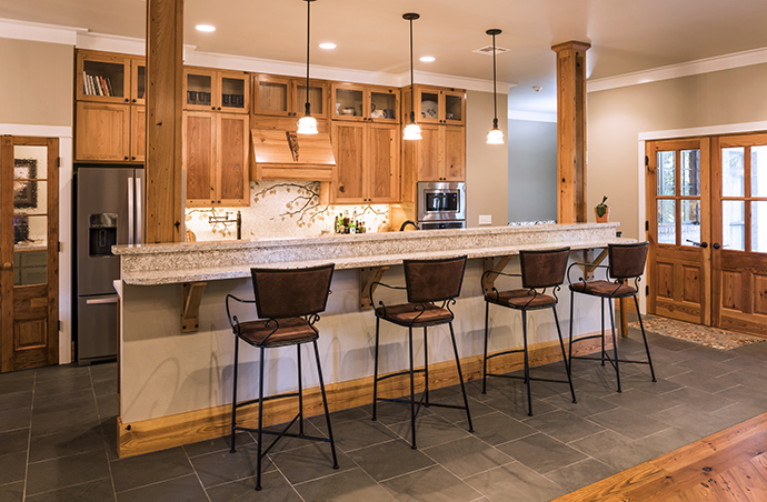 To achieve the privacy the couple wanted, the entry doors lead into a wood-clad foyer, where a set of pre-Civil-War pocket doors stand as dividers on pivot hinges. When Nancy wants light to fill the main room, she easily pushes these huge, heavy doors open; when she wants privacy, she swings them back. The slate floor begins here in the foyer and runs clear through to the back courtyard. The cool green of the slate adds a balance to the warm wood tones and hints at French Quarter style. The designer decided to embed heart-pine flooring into the slate to create the definition desired for a living room, without adding walls. This led to adding a tray ceiling above that inlay, and suddenly the central feature of the home emerged. As in many projects, using skilled craftsmen paid off: the slate and pine flow smoothly together, and the wood inlay on the tray ceiling perfectly reflects the pattern on the floor. The tree-limb-inspired iron chandelier adds just the right touch of rustic refinement. The raised hearth and fireplace, featuring the same brick used on the exterior of the home, provide a necessary warm balance to the cool tones of the slate.
