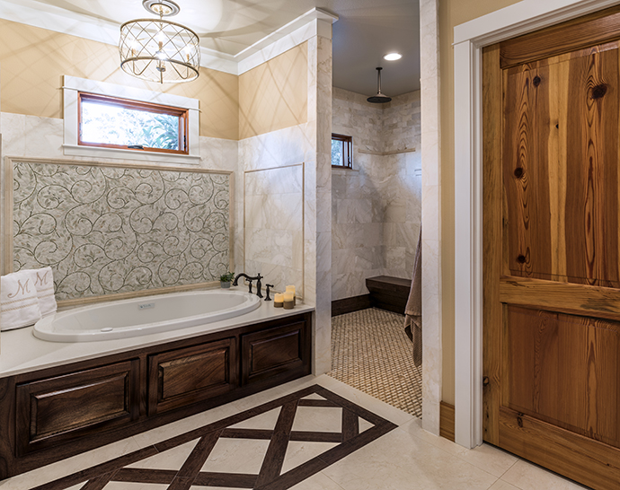 Nancy and Andrew also requested to have a small master bedroom and utilize built-in cabinetry in the closets instead of adding in furniture. The master bathroom became the crowning glory of the house. Another gorgeous tile mosaic is framed into the Calacatta Gold marble wall surround. The tilework flows into the shower, which has its own casement windows for light and air flow.