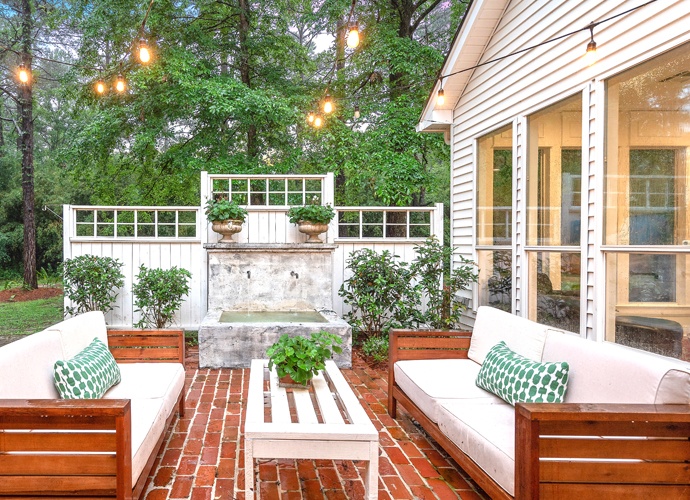 “The front is classic Acadian style with a red brick porch, square white columns and black rocking chairs. We also added an old sugar kettle that acts as a goldfish pond. We matched that feel inside with antique sconces and light fixtures. We wanted it to feel like a hundred-year-old home, but updated with a modern flow and today’s conveniences — and we did just that. Now, we can’t wait to see what our next new adventure in renovation brings!”