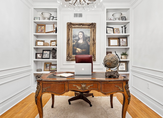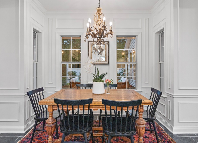 By creatively using space, a mudroom was added with window seat storage and built-in shelves, and as a buffer to transition into the primary bedroom, a library was created, also boasting built-in shelves. The primary bath area was reconfigured and finished with black and white, porcelain basketweave floors, white and subtle gray quartz countertops showcased by hand-built black cabinets, and brass fixtures. The area contains an infrared sauna and a restored, antique brass clawfoot tub and oversized shower with dual shower heads. The walk-in closet includes custom shelving and a hidden safe — all crowned by a tiered ice chandelier.