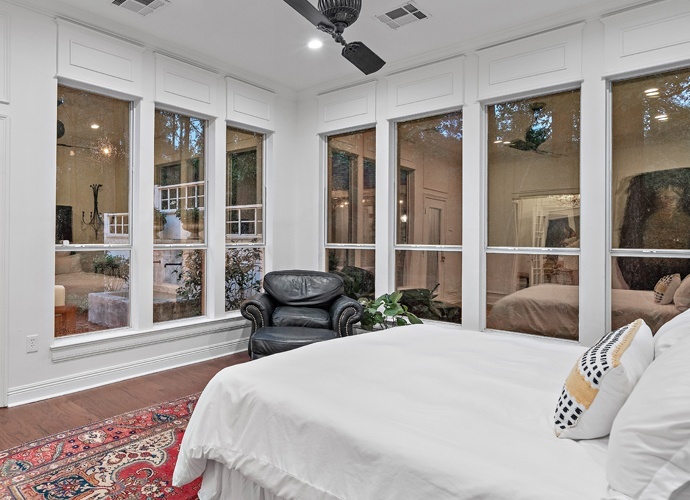 Arden is not only a craftsman but also an artist and takes pride in his attention to detail as he describes more special touches throughout the house. “I put a level five finish on the walls to get them smooth. For continuity, I sack-finished the butler’s pantry, the fireplace in the den and also brought that finish outside to the bricked courtyard. The primary bedroom opens to the courtyard, so I closed it in for functionality and charm, added a fountain and made it festive with string lights.”