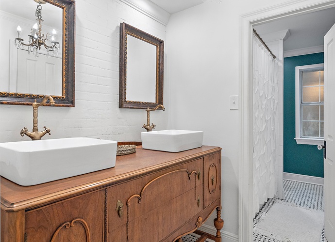 Back in the foyer, newly floored steps lead to one of two separate upstairs areas which contains three bedrooms floored in New England pine. One of the upstairs bathrooms features an antique sideboard transformed into a vanity, white subway tiled walls and the same basketweave tiled floor from downstairs. The other upstairs area offers two bedrooms, a bathroom plus a bonus room.