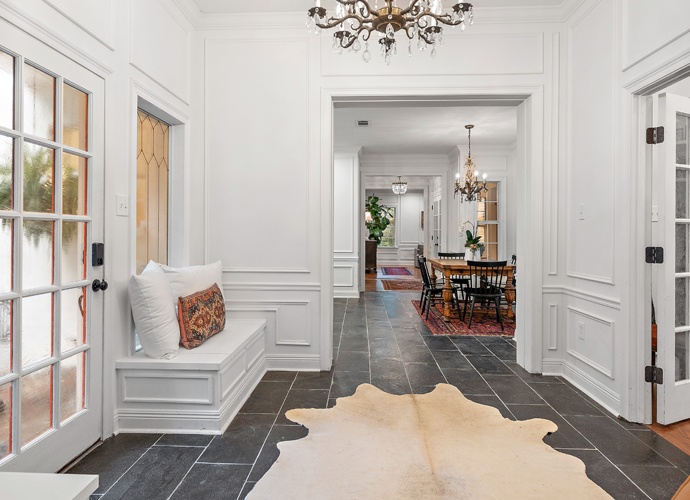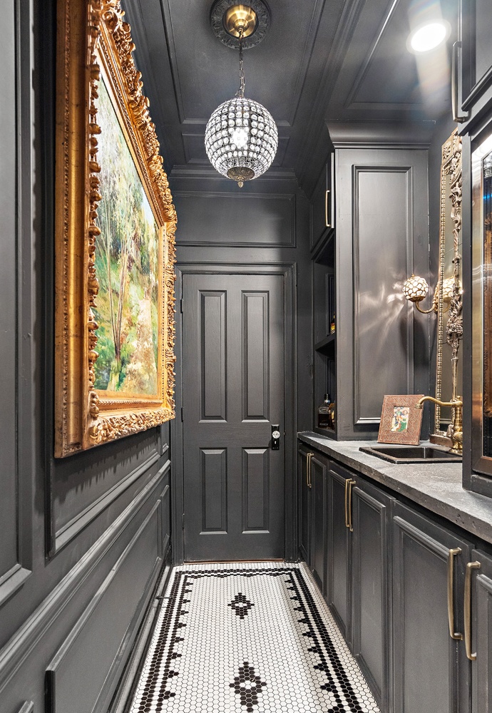 To bring their vision to life, the renovation professionals knew they needed to reconfigure the layout to be more usable by moving walls and changing the function of existing rooms. First, they created an impressive twenty-foot-high entry foyer by opening up a portion of the second story. Two of the original eight bedrooms and a Jack-and-Jill bath were re-imagined into a formal living room and an office with a wet bar in between. Arden finished the office with built-ins and added picture molding and chair rail to both new rooms. The original laundry room was turned into a butler’s pantry and the utility is now housed in what once was the primary bedroom’s closet. Black and white, half-inch hexagonal tile was laid in the bath, bar and pantry as a fashionable unifying element.