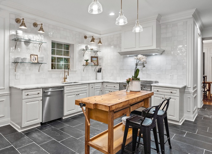 The biggest challenge the Northshore renovators said they faced, though, was the kitchen. “It was tight, but we managed to open it up. It also helps that the butler’s pantry contains an ice maker, bar sink and coffee bar.” The multi-talented team also upgraded from builder-grade to beautifully coordinated custom fixtures and finishes throughout the house. “In the kitchen, we added a black limestone tile floor, hand-made white and gray clay tiles to the walls, and Namib Fantasy countertops which have the durability of quartz and the look of marble. We even made room to fit a Hisense oversized refrigerator/freezer.”