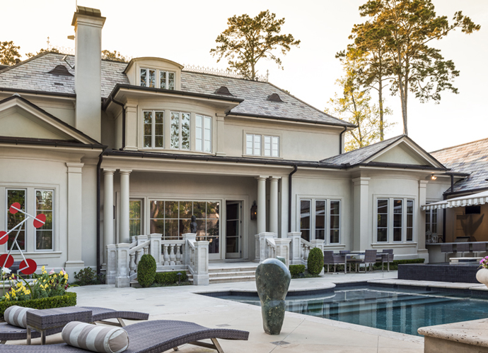 The exteriors include a mix of both whimsical moving sculptures and authoritative stonework among the formally trimmed garden plantings. The luxurious pool area seems to transport visitors straight from Louisiana to the south of France, with its creamy limestone decking and graciously proportioned swimming pool. A covered bar area with retractable banana-leaf divider walls provides all-season entertaining space for the couple, who enjoy hosting friends and family for everything from sports events to holidays. Gently curved walls also appear on the rear facade, punctuated by columns in the stucco. Sweeping stone railings give a soft, delicate appearance to material that can sometimes seem harsh. Sit and sip a chilled drink and realize that there is no harshness in this masterful mix of far and near, of local and exotic, of worldly and home.