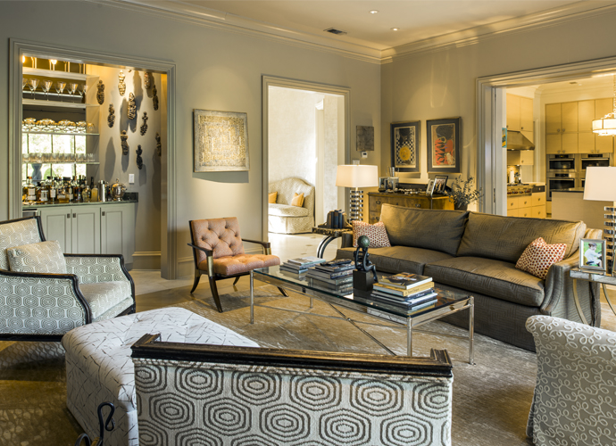 Every aspect, every detail, every element of the home was meticulously planned and executed during the design and construction. After multiple incarnations, the floor plan was finally set at 7,500 square feet, with almost no wasted space. Being serious art collectors, rooms and furniture were arranged to fit the existing pieces in the Villeres’ collection. “We’ve run out of wall space, so we’ve had to move on to sculpture,” says Susan, with no hint of regret in her voice. Pierre also has an elegant collection of antique Italian and Spanish guns, showcasing an entirely different form of artisanship. The library, where backlit shelving wraps the room, was purposefully designed to highlight these pieces. A George Dunbar metalwork piece beautifully complements the space from its custom-size niche on one end of the room.