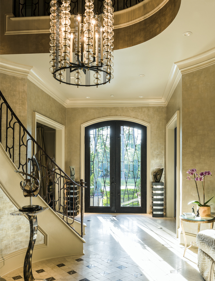 Sitting on three acres, Pierre likes to say the home “is unexpected. The outside looks like a French house, but the inside is a surprise.” Those surprises begin with the custom-made front door with its contemporary leaded glass. Expertly faux-painted to resemble rounded wood, the curved walls envelope and welcome visitors. The sculpture hints at the art collection waiting to be discovered inside.
