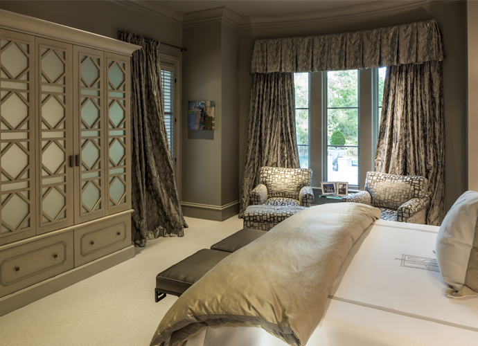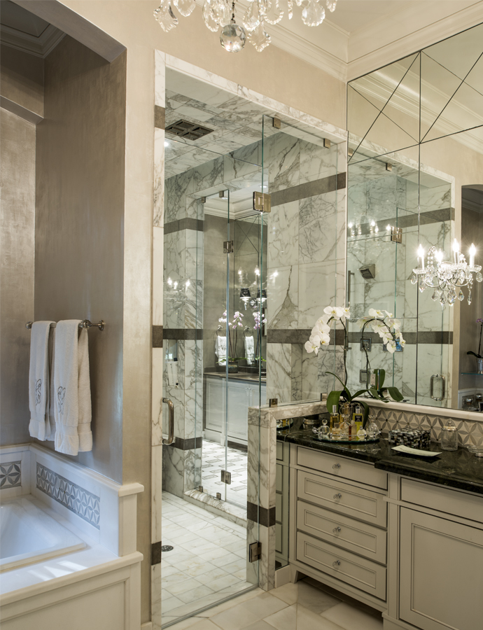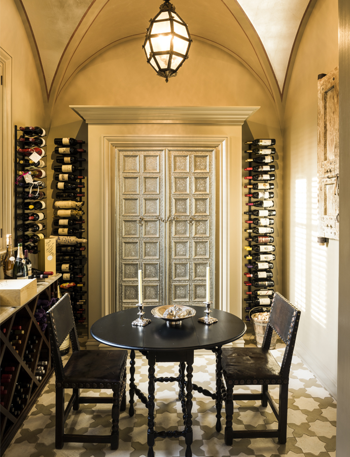 Pierre is an avid hunter and fisherman, and Susan has learned to cook accordingly, whether at this home or at their Grand Isle camp, Covey Rise cabin or New Orleans pied-a-terre. Here, her chef’s kitchen features the ultimate in modern technologies, from a built-in Miele coffee system to a smart refrigerator that keeps varying foods at their ideal temperatures. “I don’t like the wasted space in corners, so we designed the kitchen without them!” she laughs. A steam oven and warming drawers plus a 48” Wolf range are all used regularly. As the couple travels, she collects recipes to bring home and enjoy. Certain traditions play into their life together, such as enjoying a private Valentine’s Day dinner for two in the wine cellar. There, the hammered silver doors sparkle in the low light, giving a beautiful ambience to the private space. In the dining room, a room designed for evening use, an entire course can be served to guests from the butler’s pantry that separates the potentially noisy, mussed kitchen. Nothing interrupts the mood of the evening.