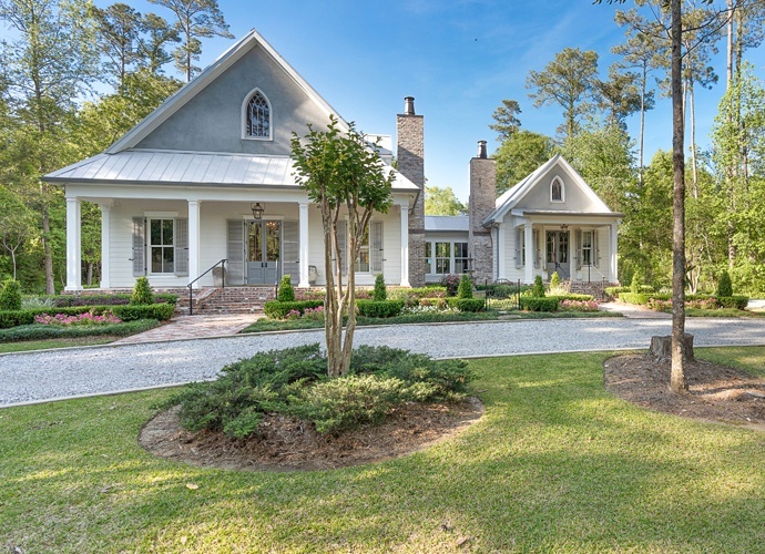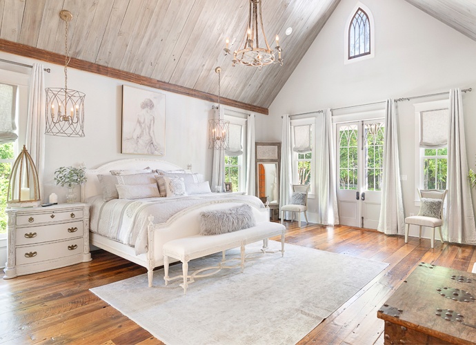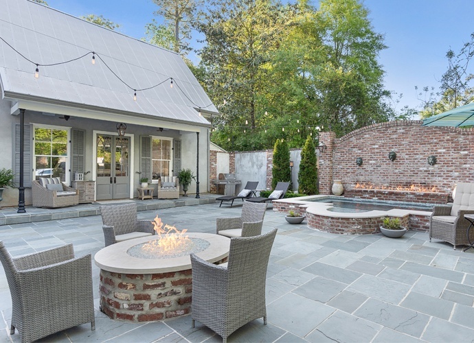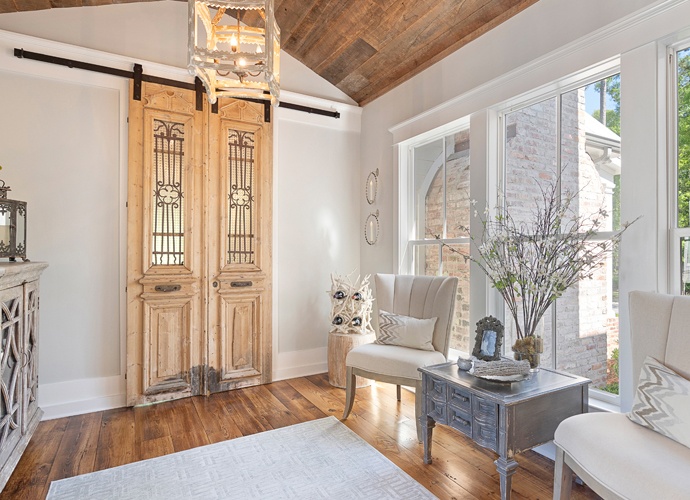 Antique European doors are hung on barn-door tracks, serving as a beautiful architectural focal point that welcomes you through the breezeway into the master suite. The privacy of the master bedroom, which is uniquely situated like an attached cottage to one side of the home, is one of her favorite features. It adds an old-fashioned charm that is hard to come by in newer homes, alluding to additions of more rooms over time. The New Orleans style courtyards that define the landscaping are filled with more traditional features of this region, such as slate tiles and water features highlighting tropical plantscapes.