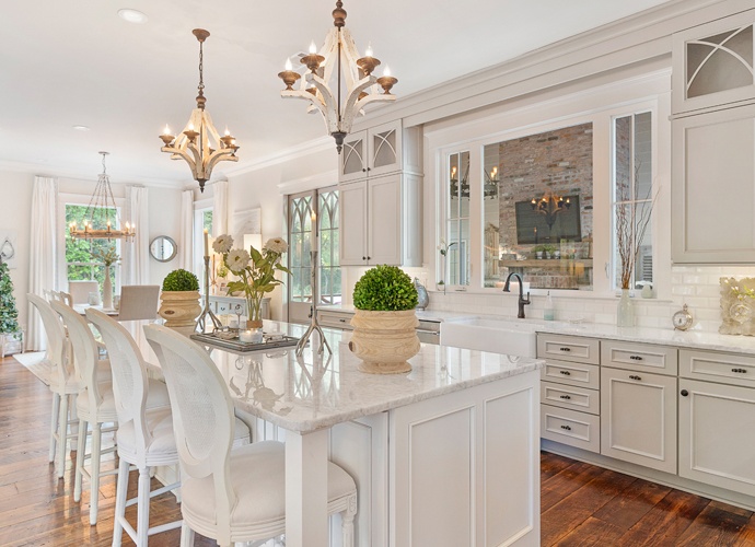Patti has always been a lover of churches and their architectural elements. Four old church windows are incorporated into the home along with her custom-designed doors, which are heavily influenced by cathedral-style entryways. The doormaker, Woodwright in Covington, was so enamored with the design that they are now available to order as part of their catalog. This custom touch provides distinctive character inside the residence, and adds a bit of personal flair with special meaning to the people who live there.