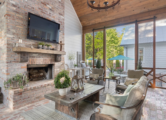 Another inviting place in the home is the brick screened-in porch where they begin each day listening to the world awaken. “It’s my favorite place to sit and pray,” says Patti of the peaceful, cozy seating area that faces a stunning floor-to-ceiling fireplace. Like the interior of the home, this indoor/outdoor space is comfortably furnished and perfect for visiting with friends or enjoying a quiet moment alone. As a refuge from the outside world, this home is truly a luxurious and peaceful haven.