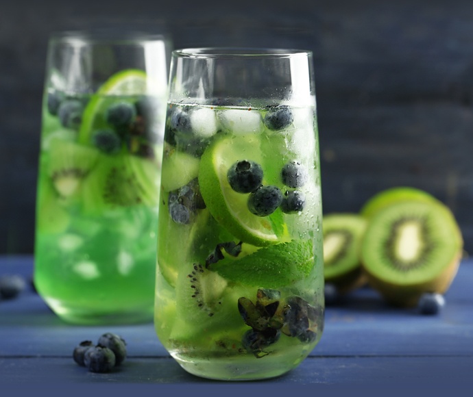 In a shaker, combine tequila, agave nectar and lemon juice. Muddle in kiwi and mint. Shake vigorously, then top with club soda to taste. Garnish with blueberry, kiwi and mint.