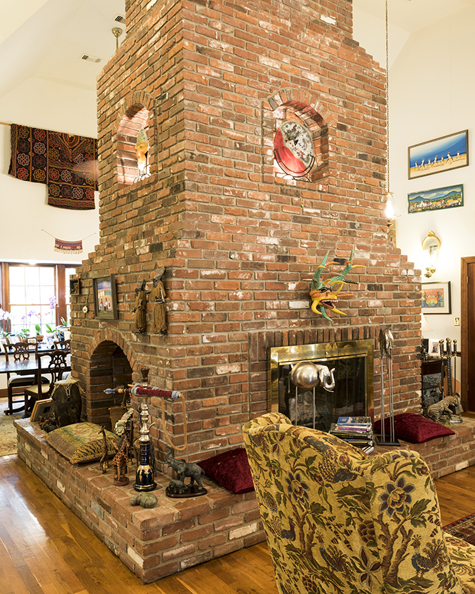 And what an impressive room it is. The structural fireplace with openings on four sides dominates the family room. “It’s over 7,000 bricks that make this thing up. It kept the house standing when a tree laid on the roof in (Hurricane) Katrina,” Dr. Marx said. He’s spent his career traveling back and forth to Africa, Indonesia, South America, particularly in equatorial countries. Along the way he has gathered a few interesting pieces himself. A photo of his safari Jeep sits quietly among some other pieces, similar to how he resides in the house: unassuming among remarkable pieces.