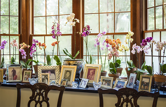 A petite lady with a splashy presence, she has an impeccable green thumb. Sonia personally planted all the azaleas around the couple’s five-acre estate and added the central fountain in the front of the house. She has amassed an orchid collection over the years so big that it requires its own greenhouse; another greenhouse is dedicated to easy-care bromeliads. These tropical plants enjoy the summers outside in the gardens, adding color and pattern to the array of native plants that form the background of the estate. The classical styling of the house provides an ideal structure for the fullness of the gardens, which spill over into the interior with plants sprinkled throughout the living spaces.