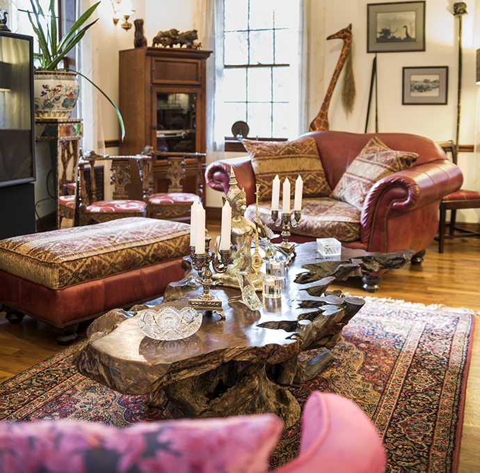 There is folk art from every continent, mixed with fine art and family photos. The sculptural coffee table in one seating area is actually a piece of redwood tree root that has been cut down to a manageable size. Lights from niches in the upper bricks give glow to Grecian blown glass plates. The dining area showcases a wedding garment from Cameroon alongside masks from Kenya. A string of cowbells in various sizes hangs beside a vibrant orchid. A console table is filled with souvenirs from Tibet. Russian dolls sit beside wooden horses from Sweden and across from old photographs of the Louisiana swamp.