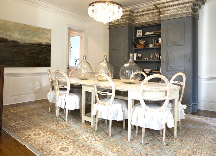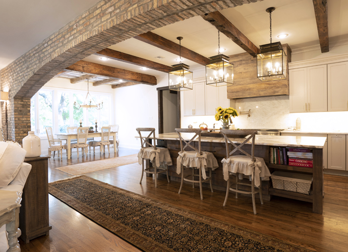 Michelle spends as much time as she can in the petite sunroom off the kitchen, from where she can see outside and inside all at once. Loads of sunlight fill the room, where she used French-inspired furnishings in a tidy, neat way to achieve a timeless ambience, with bits of Louisiana flavor mixed in. Cypress beams in the kitchen give an architectural rhythm to the heart of the home. Large-scale lighting and Shaker-style painted cabinetry combine in a crisp balance for a clean, tidy, warm family space. A hallway is lined with antique doors, each one different, adding a bit of surprise to the story of the home.