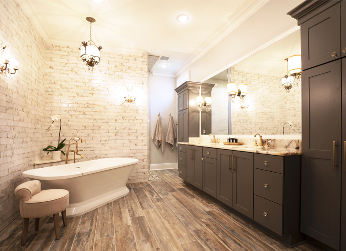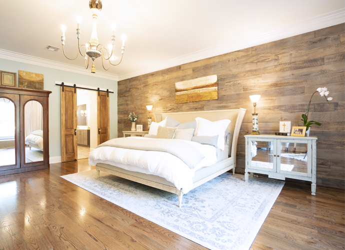 In the master suite the color palette remains neutral while the textures take over. The bedroom sports a beautiful focal wall of reclaimed wood and a pair of rustic sliding doors to the bathroom, and the classic furnishings provide the balance needed to create a luxurious and restful suite. A bit of sparkle from the mirrored nightstands adds a hotel-style touch. Behind the footed tub, a mortar-washed brick wall plays with light and shadow. Though the room is largely open, the feeling is enveloping and warm just like the family who lives here.