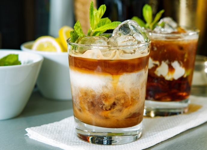 Muddle mint leaves, lemon zest and sugar in a cocktail shaker. Fill shaker with ice, then add coffee and rum. Shake vigorously for 20 seconds. Strain into an ice-filled glass. Add the cream and garnish with a mint leaf.