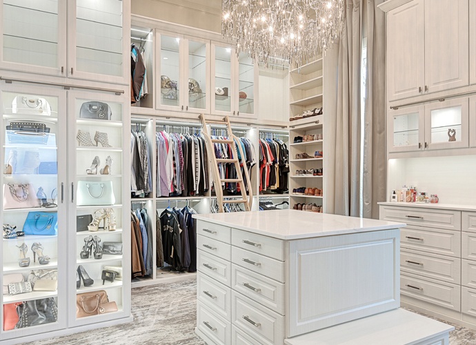 The clean, contemporary look of the tall kitchen cabinetry provides an ideal foil for the striking marble islands and backsplash. The entire kitchen is clad in Calacatta Vagli marble, and the stately pendants suspended over the island are a striking accent to a perfectly proportioned gathering area. “Natural materials have a great warmth to them and nothing man-made comes close to this look and the characteristics of the material,” Greg states.